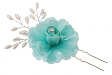 ТЕ 279082 Шпилька "Бирюзовый цветок со стразами" из ткани.Длина 6,5 см.