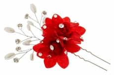 ТЕ 291720 Шпилька "Красный цветок со стразами" из ткани.Длина 6,5 см.
