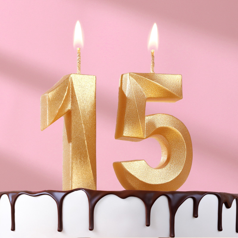 9305485 Свеча в торт "Цифра 15 лет" (набор 2 в 1) Цвет золотистый