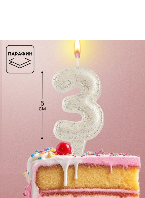 10870118 Свеча в торт "Цифра 3 Жемчужный перламутр" на шпажке Высота 6 см.