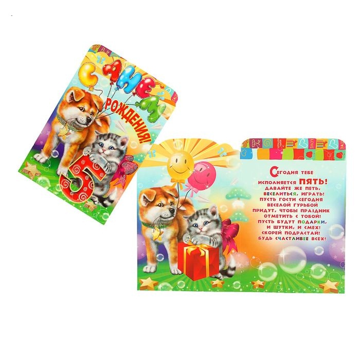 1180342 Открытка "5 лет! С Днем рождения! Котик и щенок" Формат А4