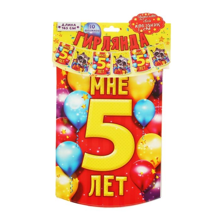 1284815 Гирлянда - вымпел " Мне 5 лет! Енотик с подарками" Длина 165 см.