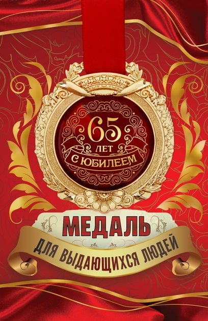 869445 Медаль красная"С Юбилеем 65 лет!" на открытке на атласной ленте
