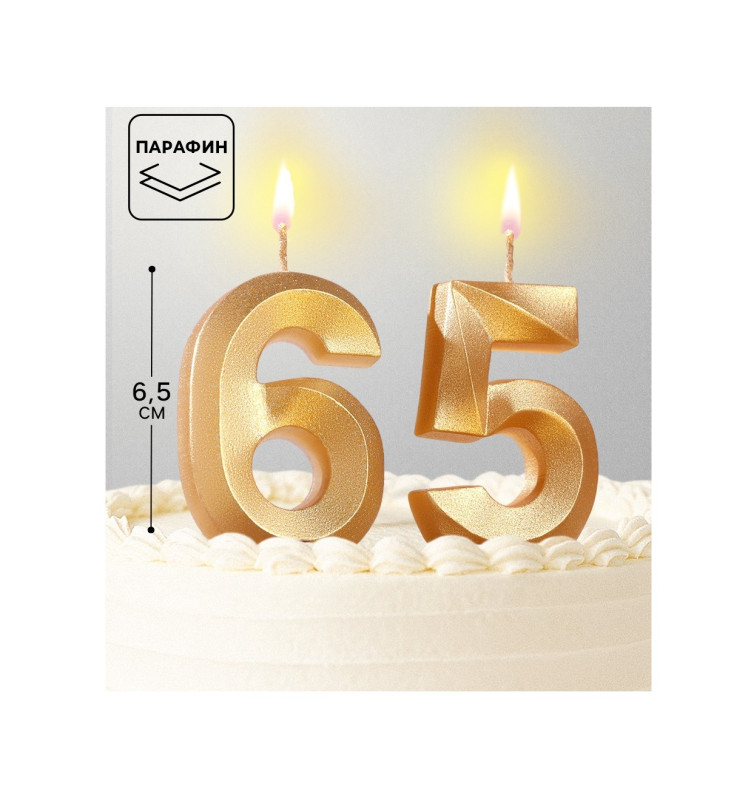 9305496 Свеча в торт "Цифра 65 лет" (набор 2 в 1) Цвет золотистый металлик Высота 6,5 см.