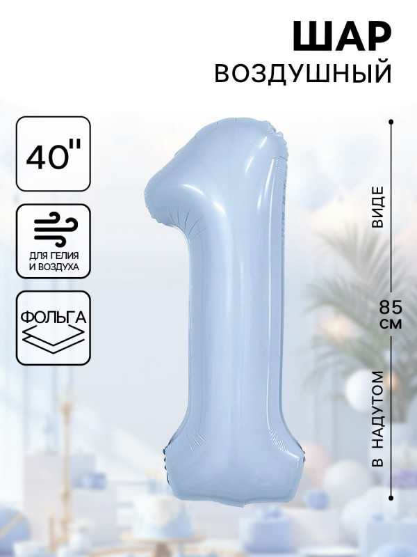 10899037 (АГ 941117) Небесно голубая Slim фольгированная "Цифра 1" Высота 102 см.