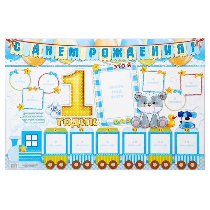 1589849 Плакат мягкий с местом под фото "1 годик! С Днем рождения" для мальчика