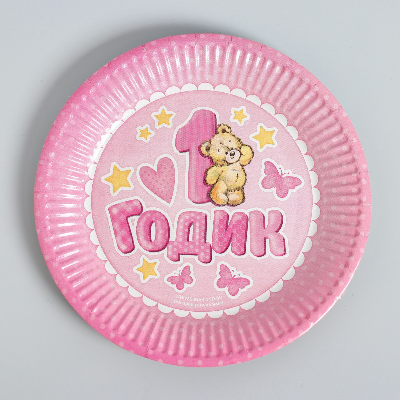 2865985/Т Набор розовых тарелок "1 годик: Мишка" (6 шт.) для девочки. D 18 см.