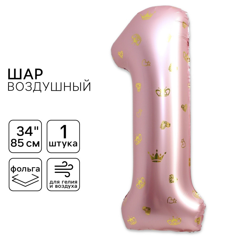 9081208 Розовая с коронами фольгированная "Цифра 1" Высота 85 см.