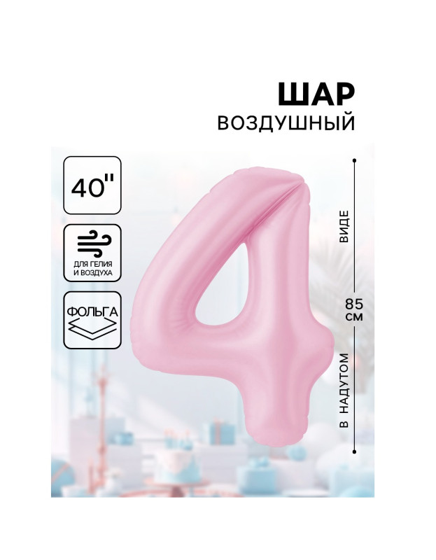 10930097 (АГ 942237) Зефирно розовая Slim фольгированная "Цифра 4" Высота 85 см.