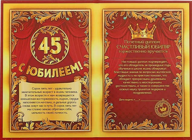 650275 Диплом мужской "С Юбилеем 45 лет!" Формат А6
