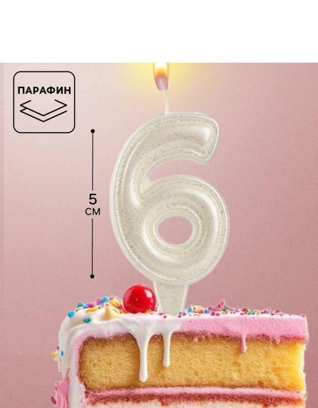 10870122 Свеча в торт "Цифра 6 Жемчужный перламутр" на шпажке Высота 6 см.