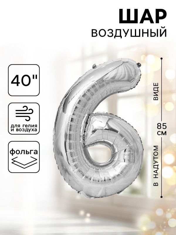 1386219 Серебряная фольгированная "Цифра 6" Высота 85 см.