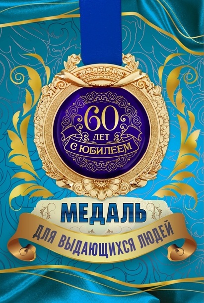 869444 Медаль синяя "С Юбилеем 60 лет!" на открытке на атласной ленте