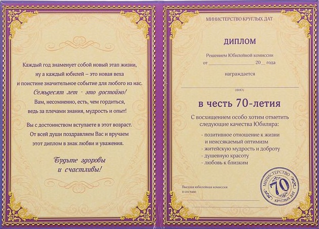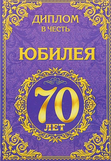 1371799 Диплом мужской "С Юбилеем 70 лет!" фиолетовый.Формат А5