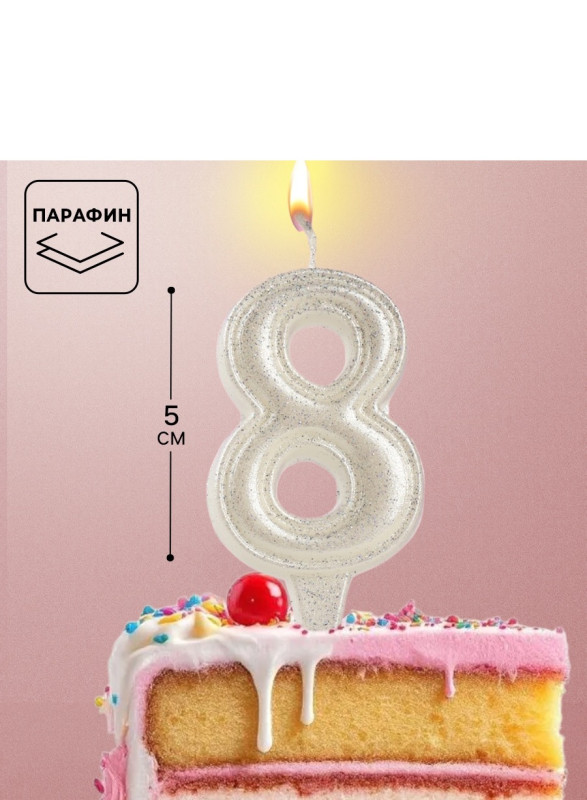 10870124 Свеча в торт "Цифра 8 Жемчужный перламутр" на шпажке Высота 6 см.