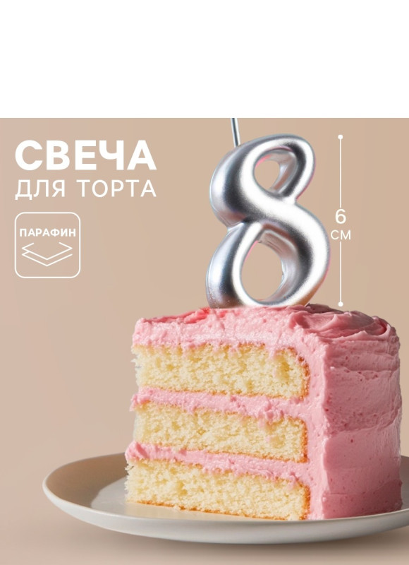 3938142 (3138) Свеча в торт "Цифра 8.Серебряный металлик" Высота 7 см.