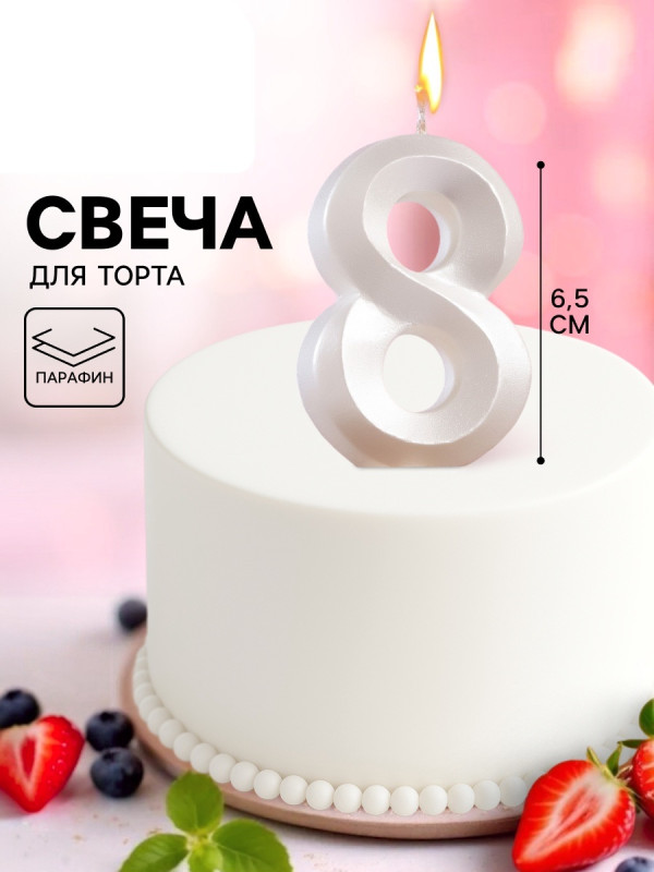 9562170 Свеча в торт "Цифра 8 Жемчужно белая" Высота 7 см.