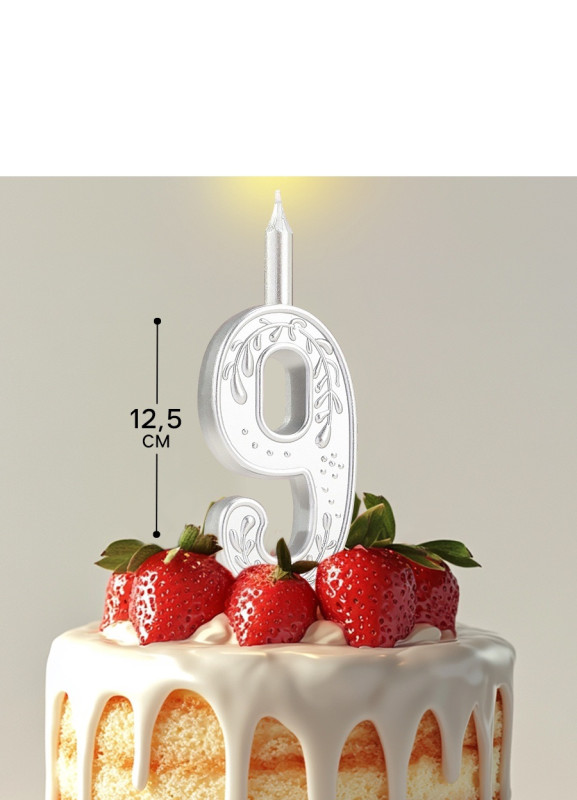 10603307 Свеча в торт "Цифра 9. Серебряный узор" Высота 9 см.