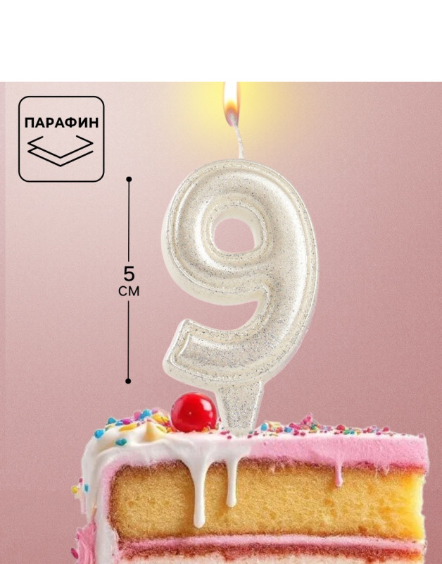 10870125 Свеча в торт "Цифра 9 Жемчужный перламутр" на шпажке Высота 6 см.