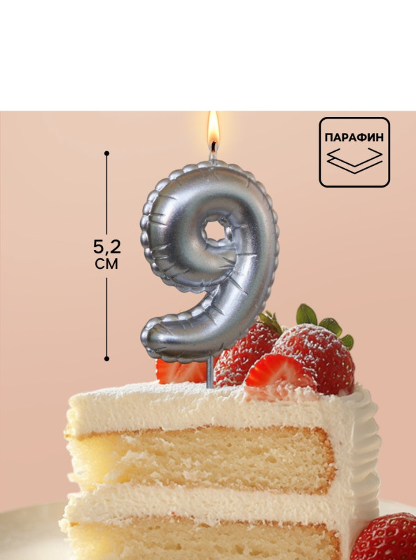 10981663 (4399) Свеча в торт "Цифра 9 Серебряная воздушная" Высота 5 см.