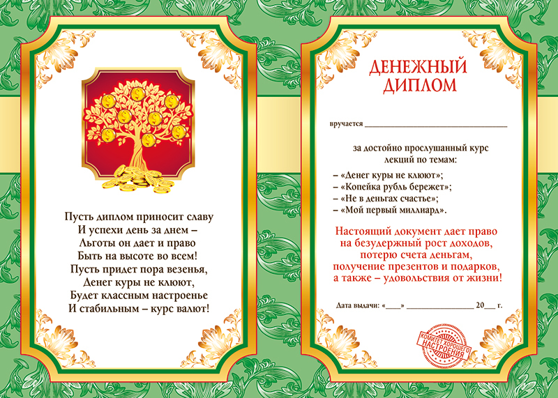 51.52.287 Диплом "Денежный" в твердом переплете.Формат А6.