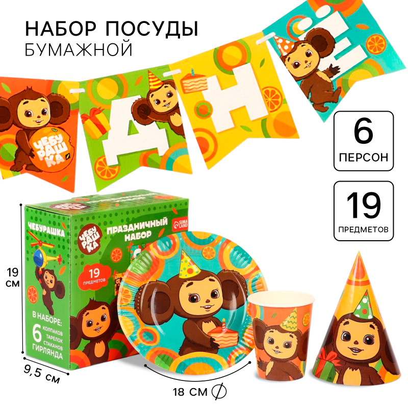 9852998 Набор бумажной посуды "Чебурашка" на 6 персон:стаканы, тарелки, колпаки и гирлянда