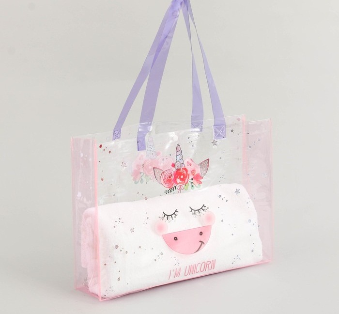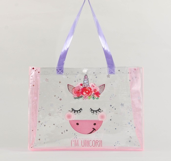 3573436 Сумка пластиковая на длинной ручке "Единорог" Размер 40 *30 *10 см. Прозрачная