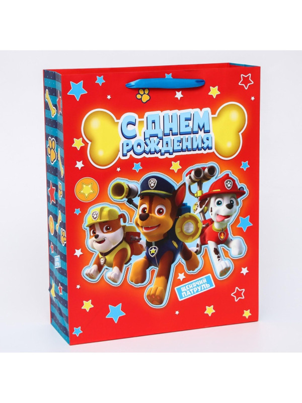 2156467 Пакет красный "С Днем рождения! Щенячий патруль" Размер 31 х 40 см. Вертикальный