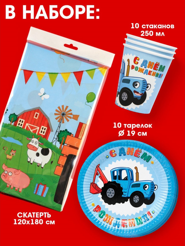 10391648 Набор бумажной посуды "Синий трактор": стаканы,тарелки,скатерть на 10 человек