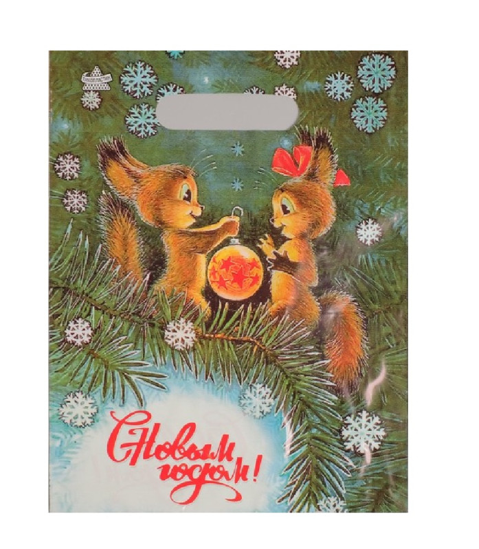 / 4526685 Пакет зеленый "С Новым годом! Два бельчонка на елке" Размер 23 х 30 см. Плотность 30 мкм