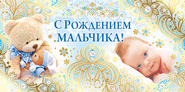 06.585.00 Конверт "С рождением мальчика! Малыш с мишкой" Тиснение золотом