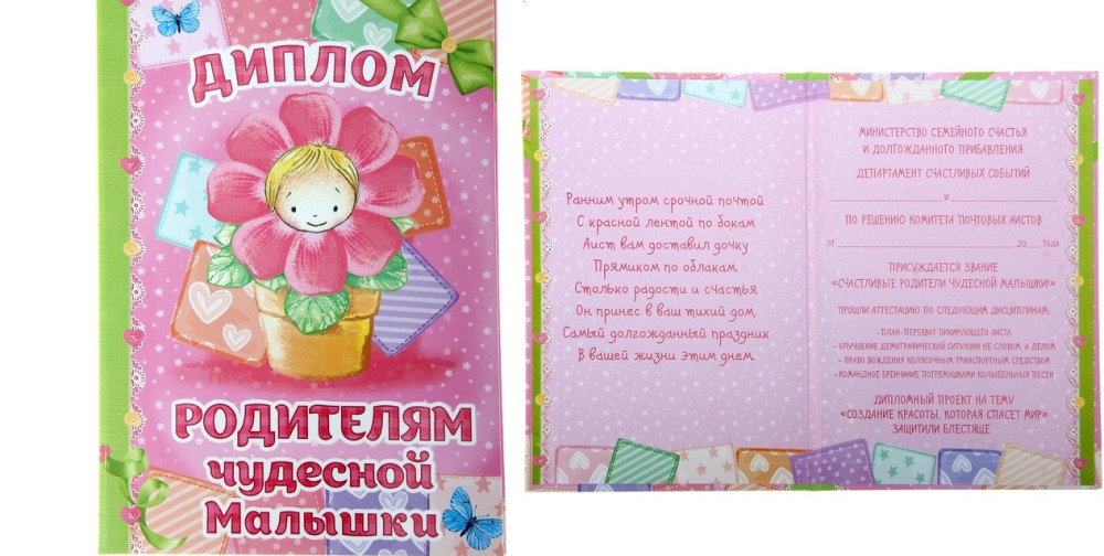 103575 Диплом родителям чудесной малышки. Формат А5. Твердая обложка
