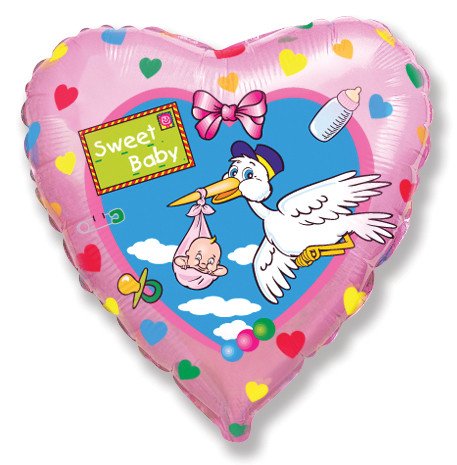 БР 201558 Розовое фольгированное сердце " Аист с малышкой" D 48 см. (с гелием)