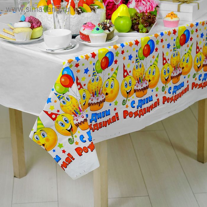 1048653 Скатерть "С Днем рождения! Смайлы и тортик" Размер 130 * 180 см.