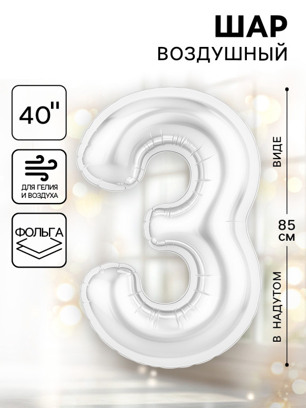 10924291 (АГ 941544) Жемчужно белый Slim фольгированная "Цифра 3" Высота 85 см.
