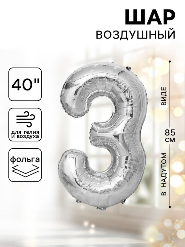 1386216 Серебряная фольгированная "Цифра 3" Высота 85 см.