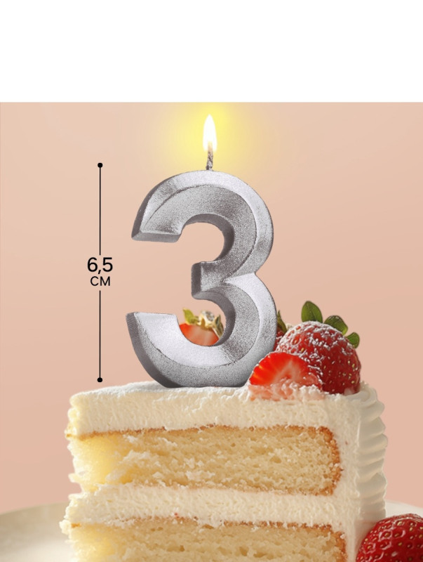 5928497 Свеча в торт "Цифра 3 Серебристый металлик" Высота 6,5 см.