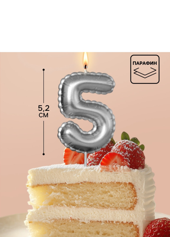 10981658 (4395) Свеча в торт "Цифра 5 Серебряная воздушная" Высота 5 см.