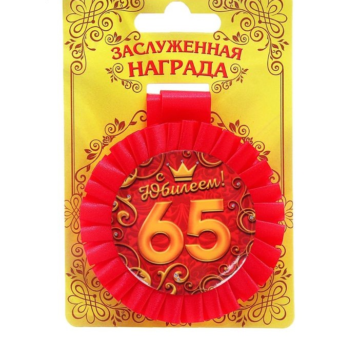 2367876 Медаль розетка красная "С Юбилеем 65 лет!" на ленте.Диаметр 8 см.Металл