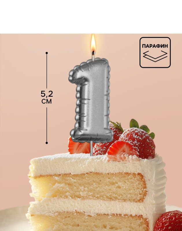 10981654 (4391) Свеча в торт "Цифра 1 Серебряная воздушная" Высота 5 см.