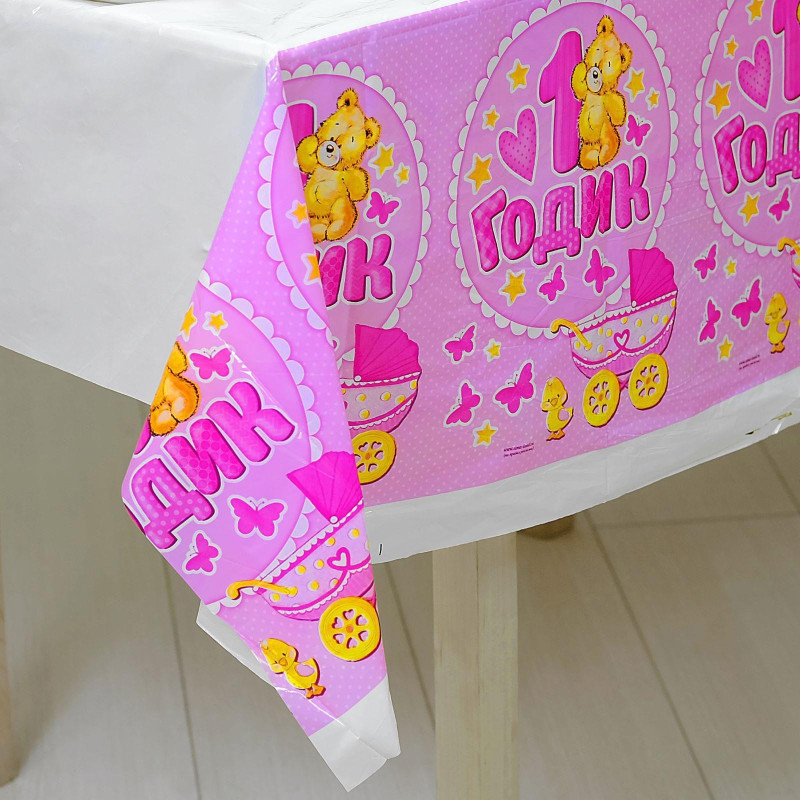 1481963 Скатерть розовая "1 годик.Мишка" для девочки. Размер 137 х 180 см.