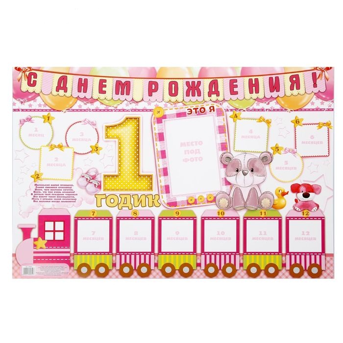 1589850 Плакат мягкий с местом под фото "1 годик! С Днем рождения" для девочки