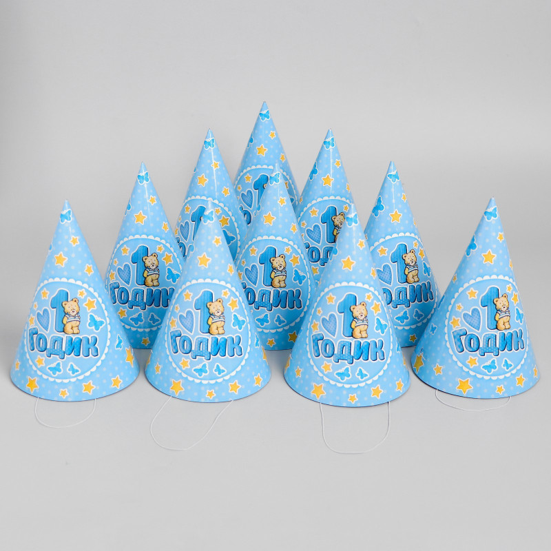 2302938 Набор голубых колпаков "1 годик: Мишка" ( 10 шт.) для мальчика