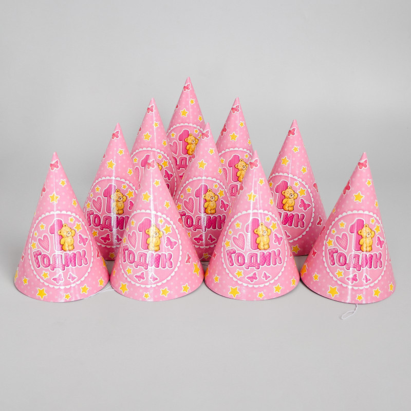 2302939 Набор розовых колпаков "1 годик: Мишка" ( 10 шт.) для девочки