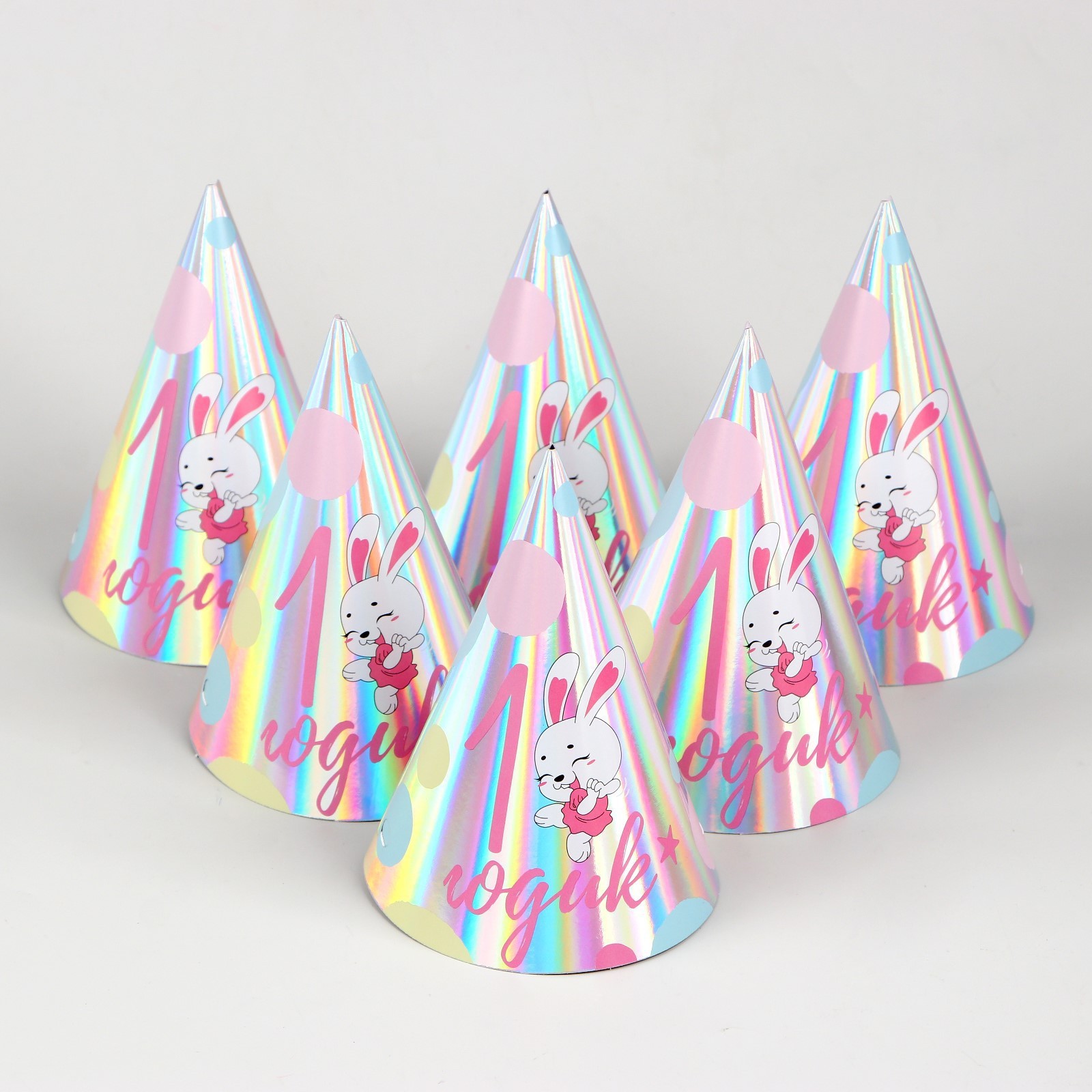 7870868 Набор белых голографических колпаков "1 годик: Зайка" ( 6 шт.) для девочки