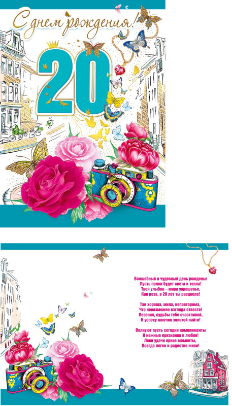 060.416 Открытка "20 лет. С Днем рождения!" Тиснение золотом.Формат А4
