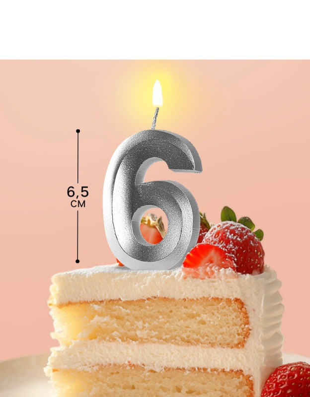 5928500 Свеча в торт "Цифра 6 Серебристый металлик" Высота 6,5 см.