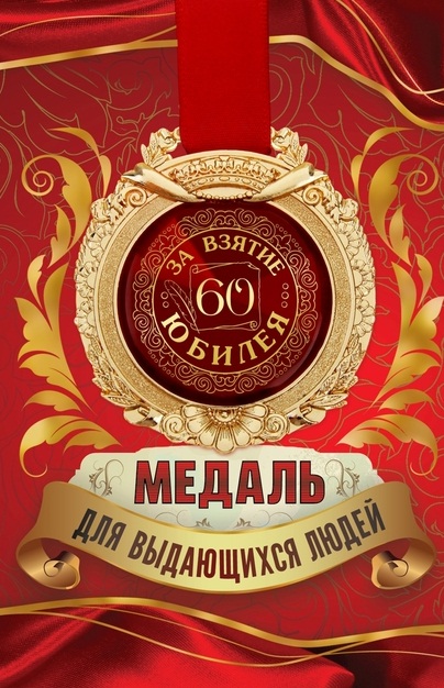 869540 Медаль красная "За взятие юбилея 60 лет!" на открытке на атласной ленте