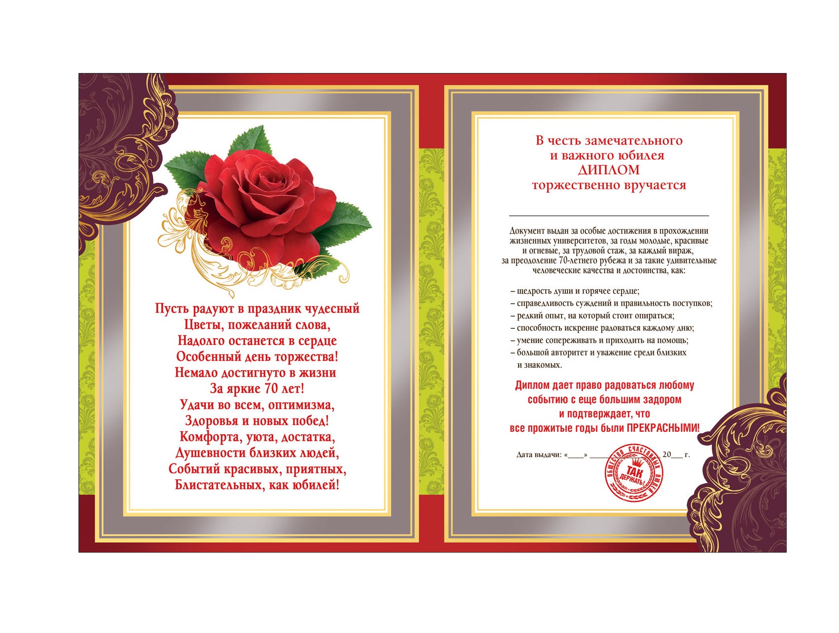 51.52.403 Диплом "70 лет" в твердом переплете.Тиснение золотом.Формат А5