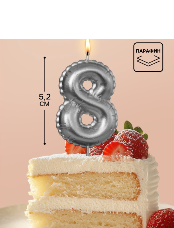 10981662 (4398) Свеча в торт "Цифра 8 Серебряная воздушная" Высота 5 см.